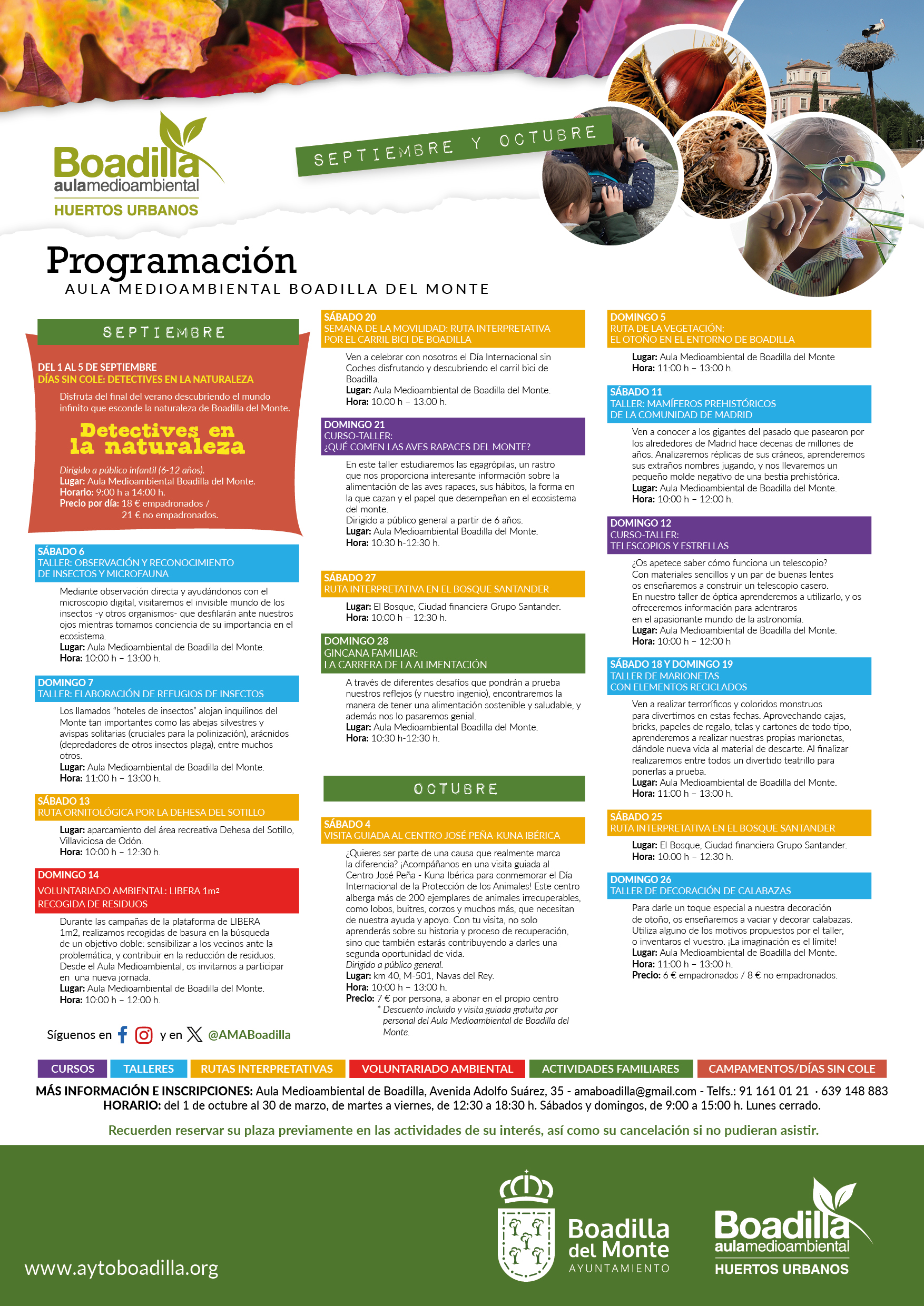 Para poder inscribirse a las actividades se debe enviar un correo electrónico a la dirección amaboadilla@gmail.com indicando la actividad específica en la que se desea participar y el número de asistentes, en el caso de que en la actividad participen menores se deberá indicar su edad. Tras recibir el correo electrónico de solicitud de plaza, desde el Aula contactaremos con los interesados para confirmar su inscripción.